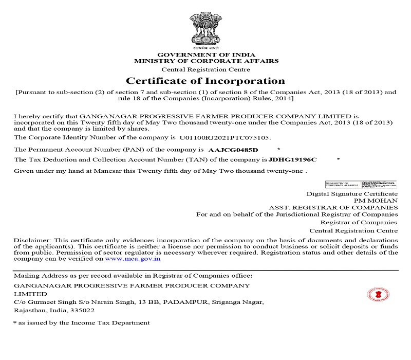 Ganganagar Progressive Farmer Producer Company Limited is a Private incorporated on 25 May 2021. It is classified as Non-govt company and is registered at Registrar of Companies, Jaipur. Its authorized share capital is Rs. 1,500,000 and its paid up capital is Rs. 100,000. It is inolved in Growing of crops; market gardening; horticulture Ganganagar Progressive Farmer Producer Company Limited's Annual General Meeting (AGM) was last held on N/A and as per records from Ministry of Corporate Affairs (MCA), its balance sheet was last filed on N/A. Directors of Ganganagar Progressive Farmer Producer Company Limited are Rahul Sood, Gurmeet Singh, Raja Ram, Mahender and Gagandeep Kaur. Ganganagar Progressive Farmer Producer Company Limited's Corporate Identification Number is (CIN) U01100RJ2021PTC075105 and its registration number is 75105.Its Email address is ganganagar.farmer@gmail.com and its registered address is C/o Gurmeet Singh S/o Narain Singh 13 BB PADAMPUR Sriganga Nagar RJ 335022 IN.